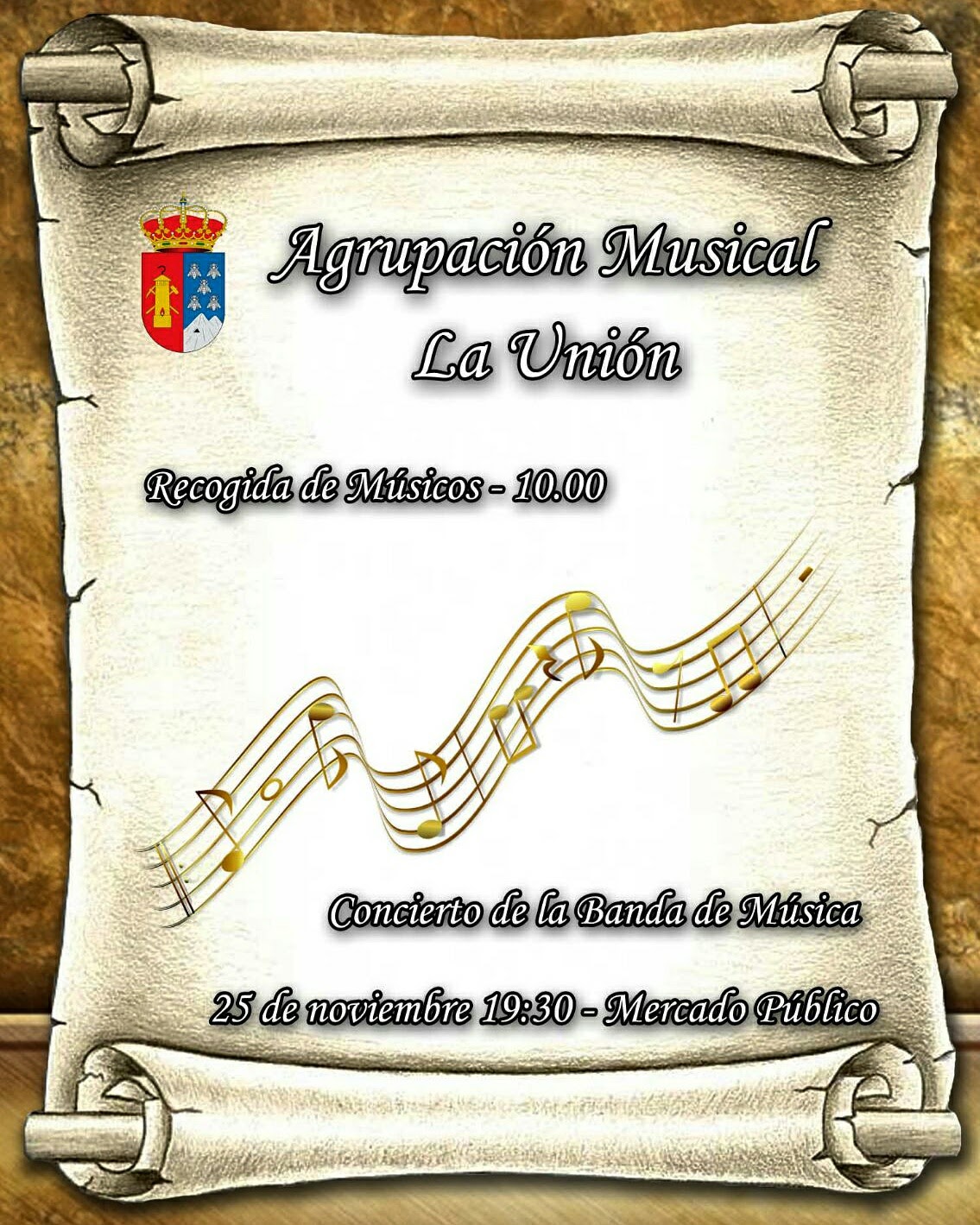 El próximo sábado 25 de noviembre, la Agrupación Musical La Unión celebra Santa Cecilia. Comenzamos los actos de ese día con la recogida de los nuevos músicos que se incorporan a la banda de. música a las 10:00 horas por las calles de La Unión y posteriormente a las 19:30 horas, en el Mercado Público de La Unión, concierto de la Banda de la Agrupación Musical La Unión y ceremonia de apadrinamiento de los nuevos músicos. Entrada gratuita.
